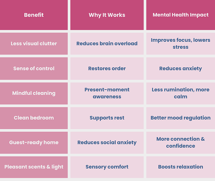 This is not just a coincidence. The connection between our physical space and mental state is stronger than most people realize. A clean home does more than please the eye — it can reduce stress, improve focus, lift your mood, and even help you sleep better.